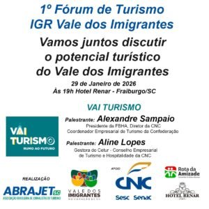 Também participam como palestrantes Natália Latrechia, presidente da IGR Vale dos Imigrantes e Diretora de Fraiburgo, Adelino Dias, presidente da Rota da Amizade Convention & Visitors Bureau. e Aline Lopes – Gestora do Turismo da CNC