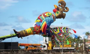 “Estamos há cerca de 20 dias aqui no Recife, trabalhando no projeto desse carro, e pretendemos somar, com aquilo que sabemos e fazemos lá para o Festival de Parintins, a essa festa já tão bonita e representativa da cultura pernambucana. O público pode aguardar um galo bem vivo, podemos dizer assim, em um carro com muito verde, araras, onça, mico-leão-dourado e outros elementos da nossa natureza”, adianta Iran Martins, artista visual que lidera o grupo.